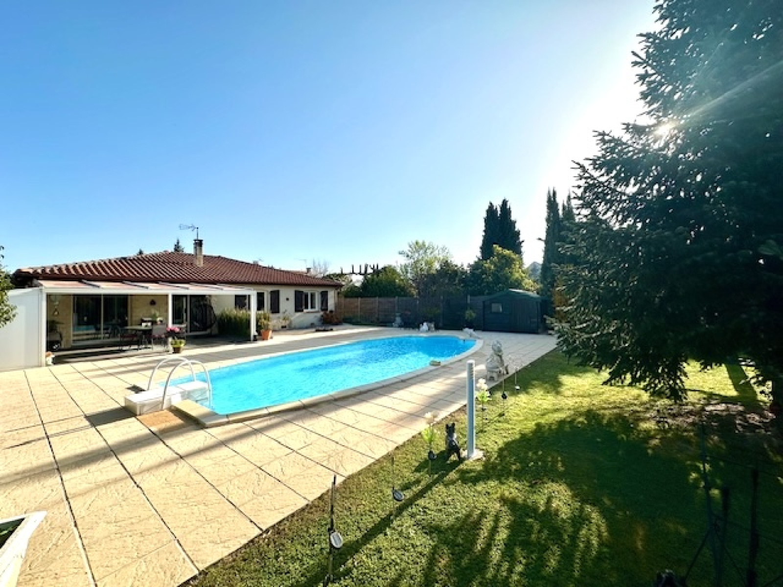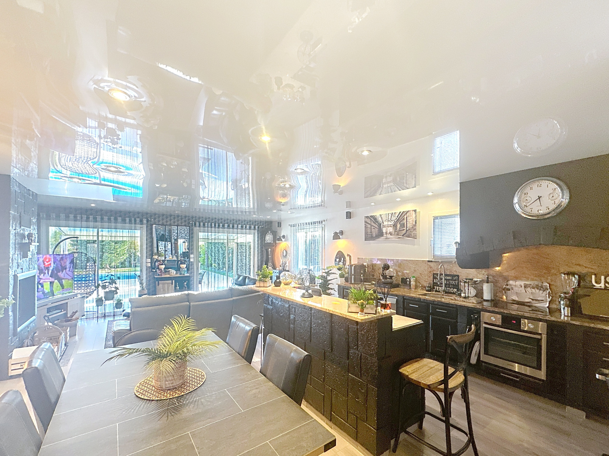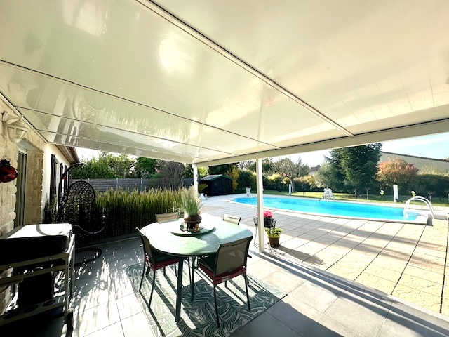 • Une grande pièce de vie lumineuse, avec cuisine ouverte et équipée, donnant sur la piscine.