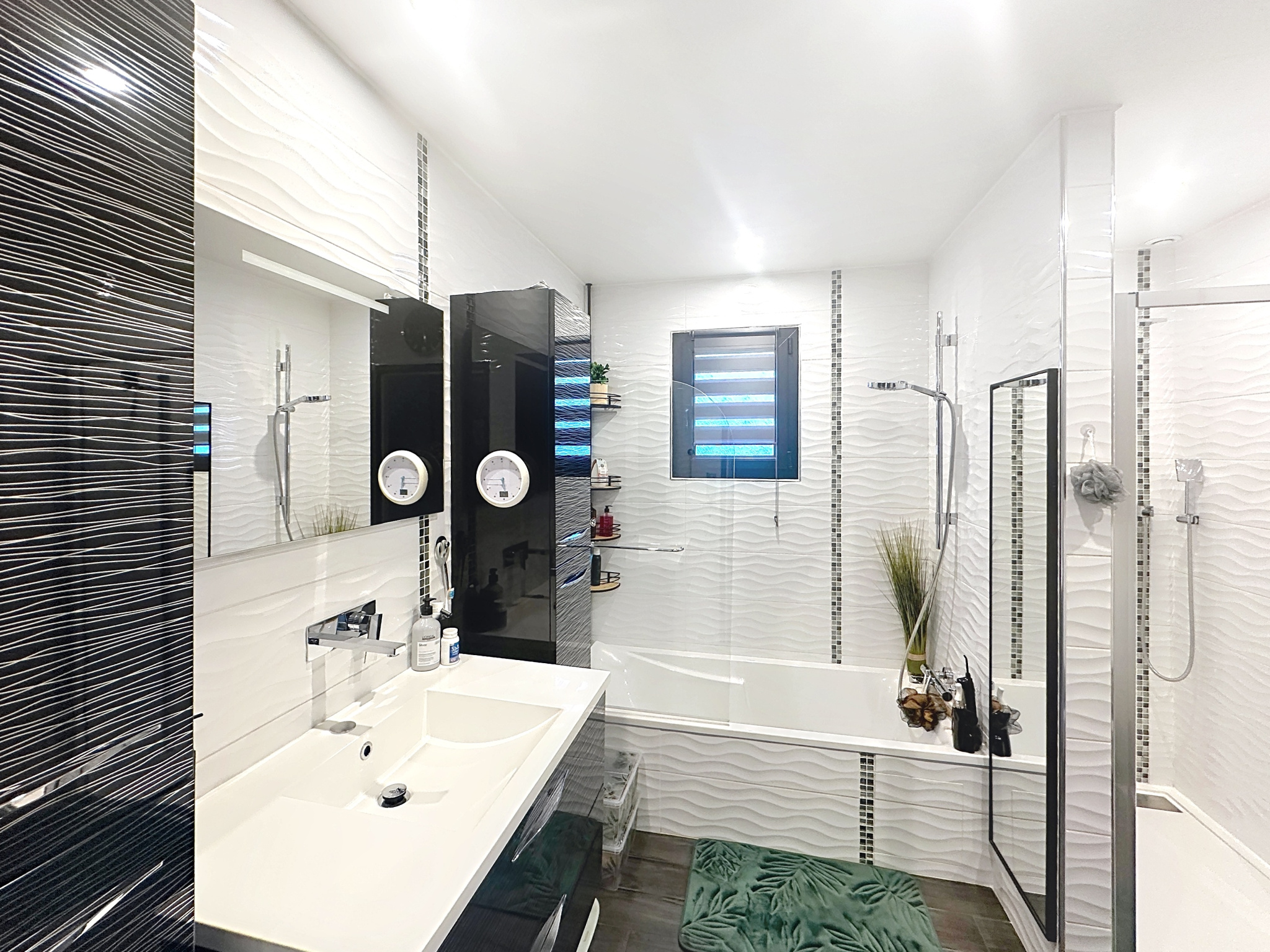• Une salle d’eau avec douche et baignoire.